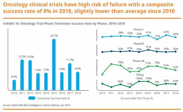 然而,肿瘤学新药开发的成功率仍然有限,在2018年虽然有15款肿瘤学NASs上市,但是新药开发成功率只有8%,比2017年还有所下降。这一下降的主要原因是1期临床试验和3期临床试验的成功率有所下降。