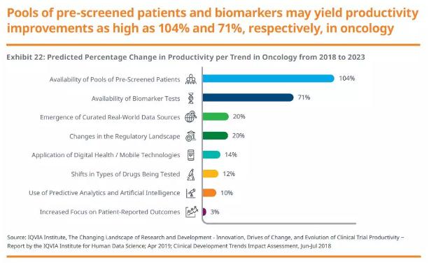 根据IQVIA研究所的评估,使用预筛患者群和生物标志物检测,可能在未来5年中分别将肿瘤学临床试验生产力提高104%和71%。