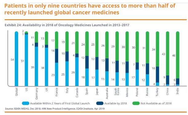 在抗癌疗法可及性方面,IQVIA的研究发现,只有9个国家的患者能够获得近期上市的全球性抗癌药物。