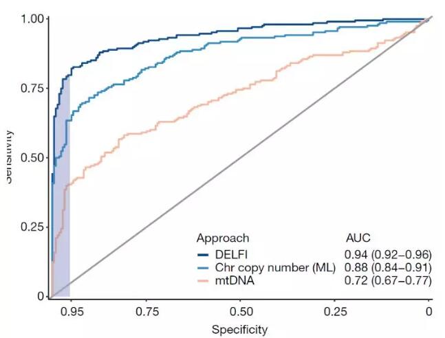 图|DELFI 在肿瘤病人的特异性识别率(来源:Genome-wide cell-free DNA fragmentation in patients with cancer)