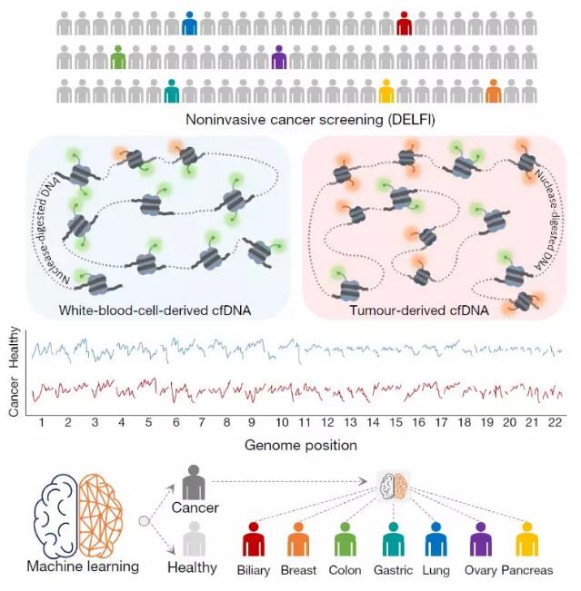 在概念验证研究中,被称为 DELFI(用于早期拦截 DNA 片段)的测试准确地检测了来自 208 名患有不同阶段乳腺癌、结肠直肠癌、肺癌、卵巢癌、胰腺癌、胃癌和胆管癌患者的血液样本,其中 57%至 99%以上患者存在循环肿瘤 DNA。DELFI 在 215 名健康人的血液样本测试中识别准确,仅在 4 例病例中错误识别。该测试使用机器学习来识别癌症患者血液中 DNA 片段的异常“包装”模式。研究人员表示,在研究这些“打包”模式后,他们可以在高达 75%的病例中识别出肿瘤的存在。该研究近日发表在 Nature 杂志上。