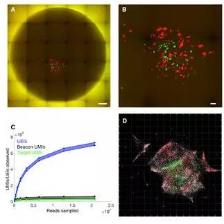 图 | 荧光显微镜图像与 DNA 显微镜对比(图 A、B 为荧光显微镜,D 为 DNA 显微镜)(来源:Cell)