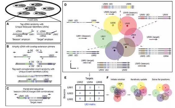 首先,研究人员将待测细胞滴在载玻片上,并进行相应的固定。随后,往细胞内注入各种各样的 DNA 标记物(这里用的是 cDNA 片段),这些 DNA 标记物会连接到与其互补的 RNA 分子上,使其具有唯一的标签。