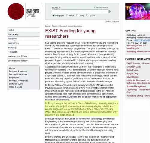 这篇名为《德国轰动世界血液检测乳腺癌》(Weltsensation aus Deutschland Bluttest erkennt Brustkrebs)的文章,揭示了中国科学家杨蓉西在德国海德堡大学工作期间,其“滴血测癌”项目从诞生到夭折的全过程,失败原因指向海德堡大学医学院专利管理公司(下称“专利管理公司”)。在这之后,此事也被国内媒体所报道。如今,杨蓉西已经回国,在南京医科大学任教。