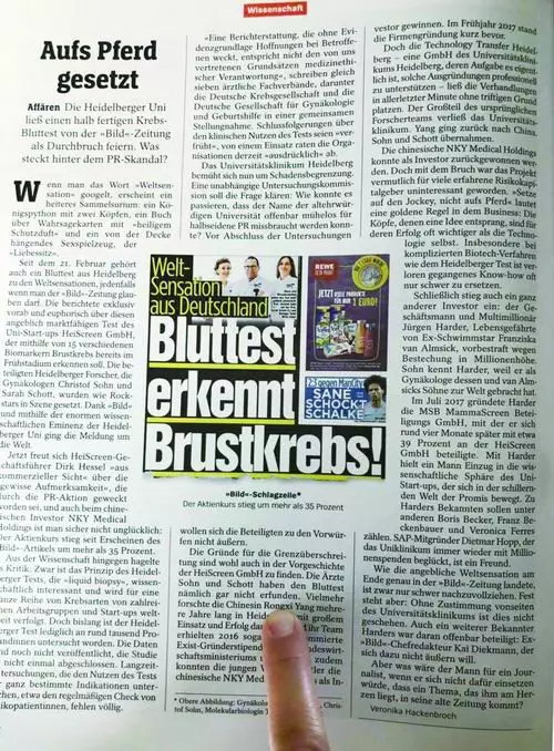 于是,有德国媒体嗅到这件事情的不寻常,《明镜周刊》女记者 Veronika Hackenbroch 开始对此事进行秘密调查。直到 3 月 29 日,《明镜周刊》刊出文章,掀开了医院这一“乳腺癌早期血液检测里程碑”研究中的关键一环——侵占中国学者成果。