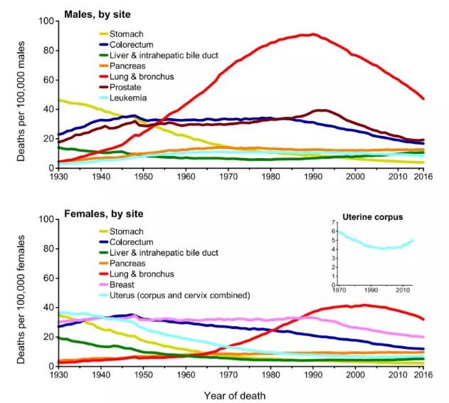 肺癌的死亡率(红色)在过去几十年里呈明显下降趋势(图片来源:参考资料[9])