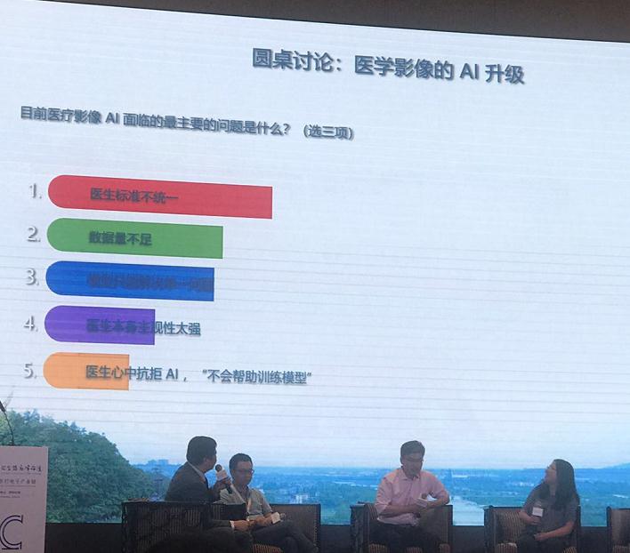 即使是截止目前落地场景最多的医学影像领域,面临的问题也不少:医生标准不统一、模型只能单一地解决问题、数据量不足、医生本身主观性太强、医生心中抗拒AI,不会帮助训练模型,其中,医生标准不统一是当日会场发起的投票调查最为凸显的问题之一。