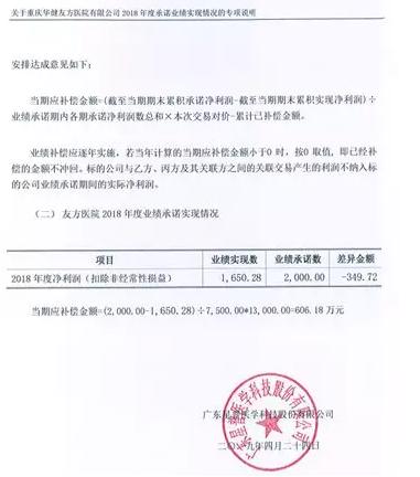 另根据上市公司星普医科(300143)今年4月的公告,该公司2018年初花了1.3亿购买的重庆华健友方医院51%股权,2018年承诺医院净利润不低于2000万,2019年不低于2500万,2020年不低于3000元,但2018年净利润只完成了1650万,当期应补偿上市公司606万元。