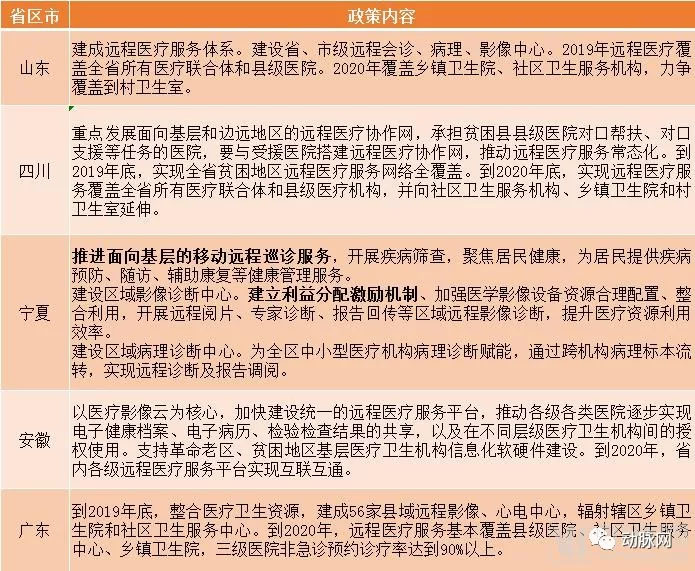 远程医疗是互联网医疗优化资源分配的重要一环,能最大程度推动分级诊疗的实现。各省市制定推进远程医疗的政策,主要有以下几个方面: