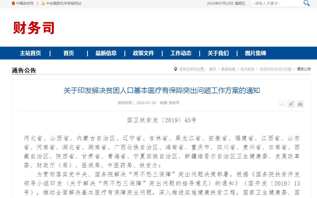 医谷讯:昨日(7月18日),国家卫健委、国家发改委、财政部、国家医保局、国家中医药局和国务院扶贫办联合制定并印发《解决贫困人口基本医疗有保障突出问题工作方案》(下称工作方案),明确提出要加强县乡村医疗卫生机构建设,配备合格医务人员,消除乡村两级机构人员“空白点”,做到贫困人口看病有地方、有医生、有制度保障。