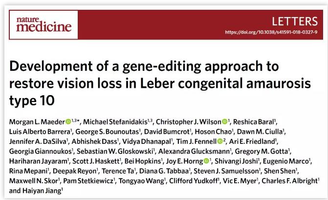 2019年1月23日,Editas Medicine公司(创始人为张锋)的Morgan L. Maeder等人在顶级医学期刊 Nature Medicine 杂志发表题为:Development of a gene-editing approach to restore vision loss in Leber congenital amaurosis type 10 的研究论文。