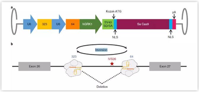 为克服这一局限,Editas Medicine开发了一种特异于CEP290 IVS26突变的基因编辑策略,使用AAV5载体通过视网膜下注射将saCas9和CEP290特异性gRNA递送至感光细胞,通过双gRNA分别靶向突变内含子区域的上下游,直接将突变内含子区域整体删除或倒位,从而恢复CEP290基因的正常表达。