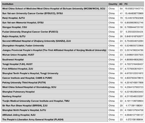排名表格中,论文计数(AC)指不论一篇文章有一个还是多个作者,每位作者所在的国家或机构都获得1个AC分值;分数式计量(FC)则考虑了每位论文作者的相对贡献。