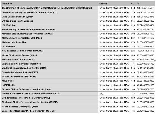 上述排名与中国医学科学院医学信息研究所发布的“中国医院科技量值评价”排名有不小的差距。2018年中国医院科技量值评价榜单前三名分别是华西医院、中国人民解放军总医院及北京协和医院,在“自然指数”中,华西医院仍排第一,中国人民解放军总医院排在第25位,而北京协和医院甚至没有进前25,而是以AC=12,FC=1.77的成绩排在了第56位。排名的变化,与评价体系的不同有关。