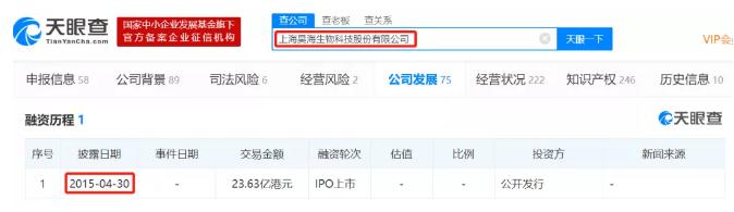 据天眼查信息显示,上海昊海生物科技股份有限公司在2015年4月30日就完成了上市。