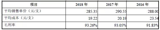 昊海生科还在招股书中披露了玻尿酸产品的平均单价和成本,2018年,该公司一支成本为19.22元的玻尿酸产品,销售单价能达到285.35元,毛利率高达93.26%,堪比茅台。