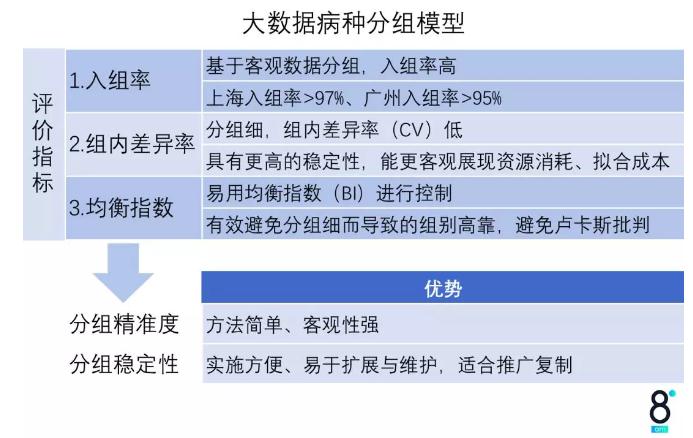 每一个疾病诊断加上治疗方法,都有在大数据全样本中的标准定位,反映它的资源消耗程度。在此基础上,大数据DRGs分析出病例组合指数(case-mix Index,简称CMI)、药品指数以及耗材指数,这些标准形成了对公立医院产出的评价。