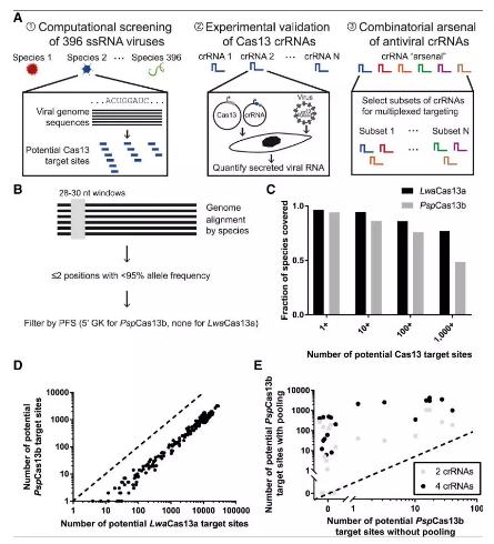 然后,他们通过计算分析测序数据,以确定数百种病毒物种中的数千个潜在位点,这些位点可能是Cas13的有效靶标。接下来,研究人员设计了该系统的Cas13指导RNA。