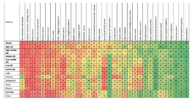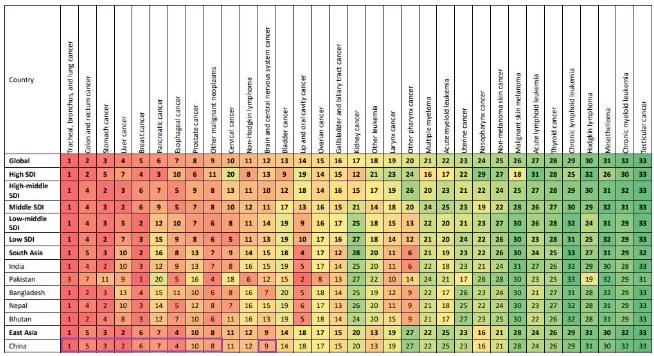 这十年间,几乎所有国家的癌症新发病例数都增加了,病例数增长最多的是在社会人口指数(生育率、教育程度和收入的综合指标)水平中等及偏低的地区。
