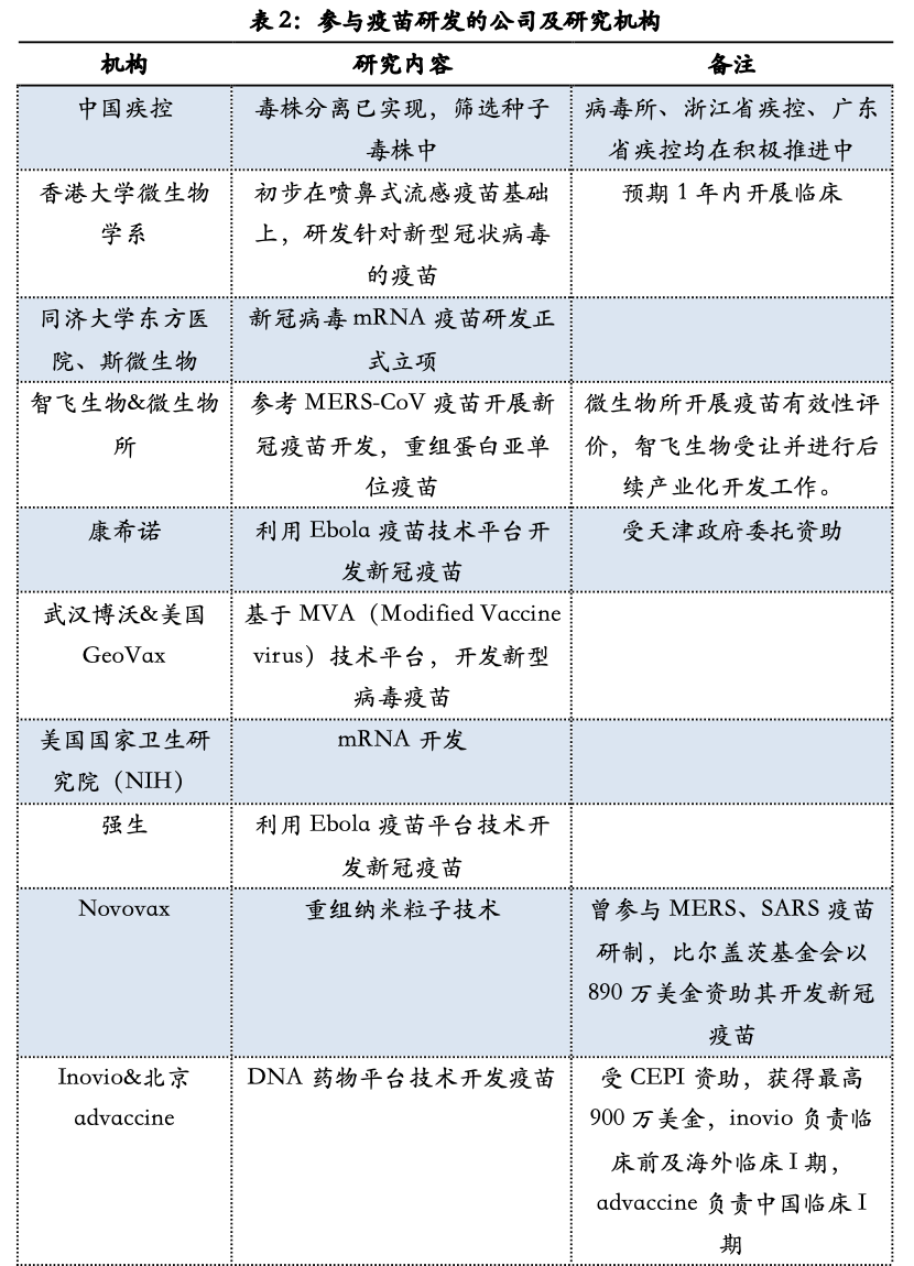 从疫苗开发周期来看,即使是mRNA疫苗,也很难在疫情结束前实现产品临床应用。新冠病毒疫苗的研发更多是为了预防未来可能的疫情发生。对于类似流感一样周期性爆发的预防疫苗产品开发,其市场空间大,产品生命周期长,经济效益高,企业研发动力强。对于偶发性疾病,从经营企业投入产出比角度考虑,产品开发出来后可应用场景有限,研发投入与未来市场销售收入性价比低,不值得开发。我们认为,虽然目前病毒已经较之前的SARS、MERS毒性减弱且传播性更强,从趋势上看符合病毒变异趋于长期与人体共存状态,但目前我们仍不能十分确定该病毒疫情将成为类似流感一样的常规病种。就此问题,我们也咨询了疫苗研发国家队及部分民企疫苗企业的相关人员,普遍对此持有保留意见。