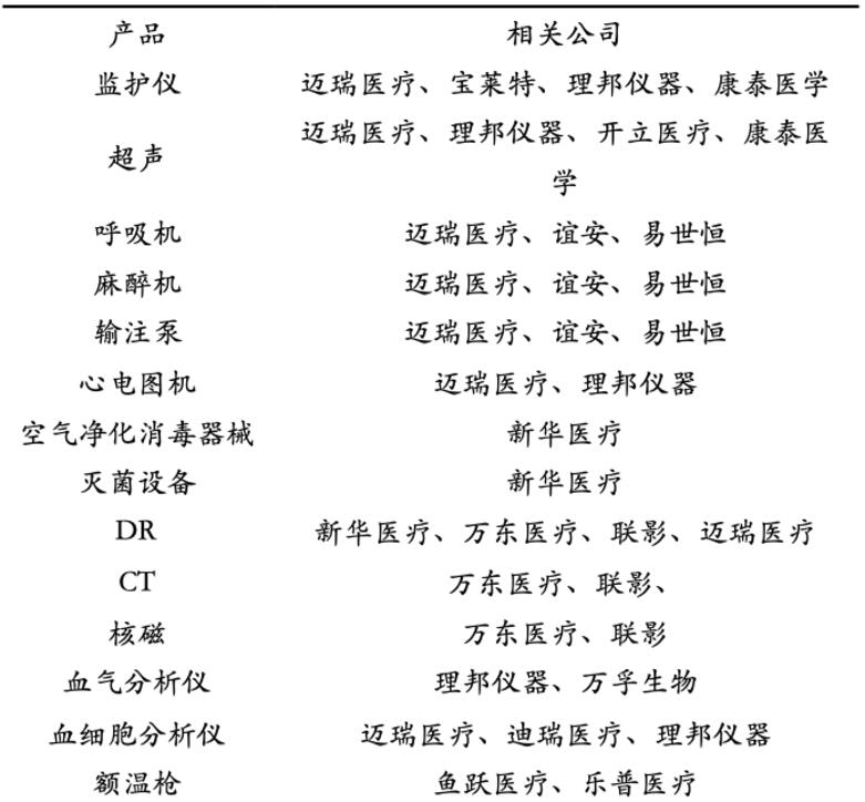 表4:医疗设备及其对应的一级和二级市场相关公司