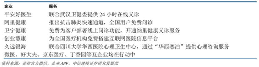 为了避免普通发热病人去医院发生交叉感染,各地医疗部门联合阿里健康、微医、腾讯等互联网企业,通过各类平台以在线形式为相关患者义诊服务推广了互联网医疗的使用习惯,但互联网医疗不应局限于原有的轻问诊模式,应该和更加直接有效的远程医疗,从而推动真正的分级诊疗。证明了监管部门对互联网在线问诊认可,视为分级诊疗有机组成部分。1月25日,武汉协和医院、同济医院、支付宝、微医等平台陆续开通线上问诊平台,针对轻症或怀疑自己症状的患者,采取免费的线上问诊方式,进行分流。