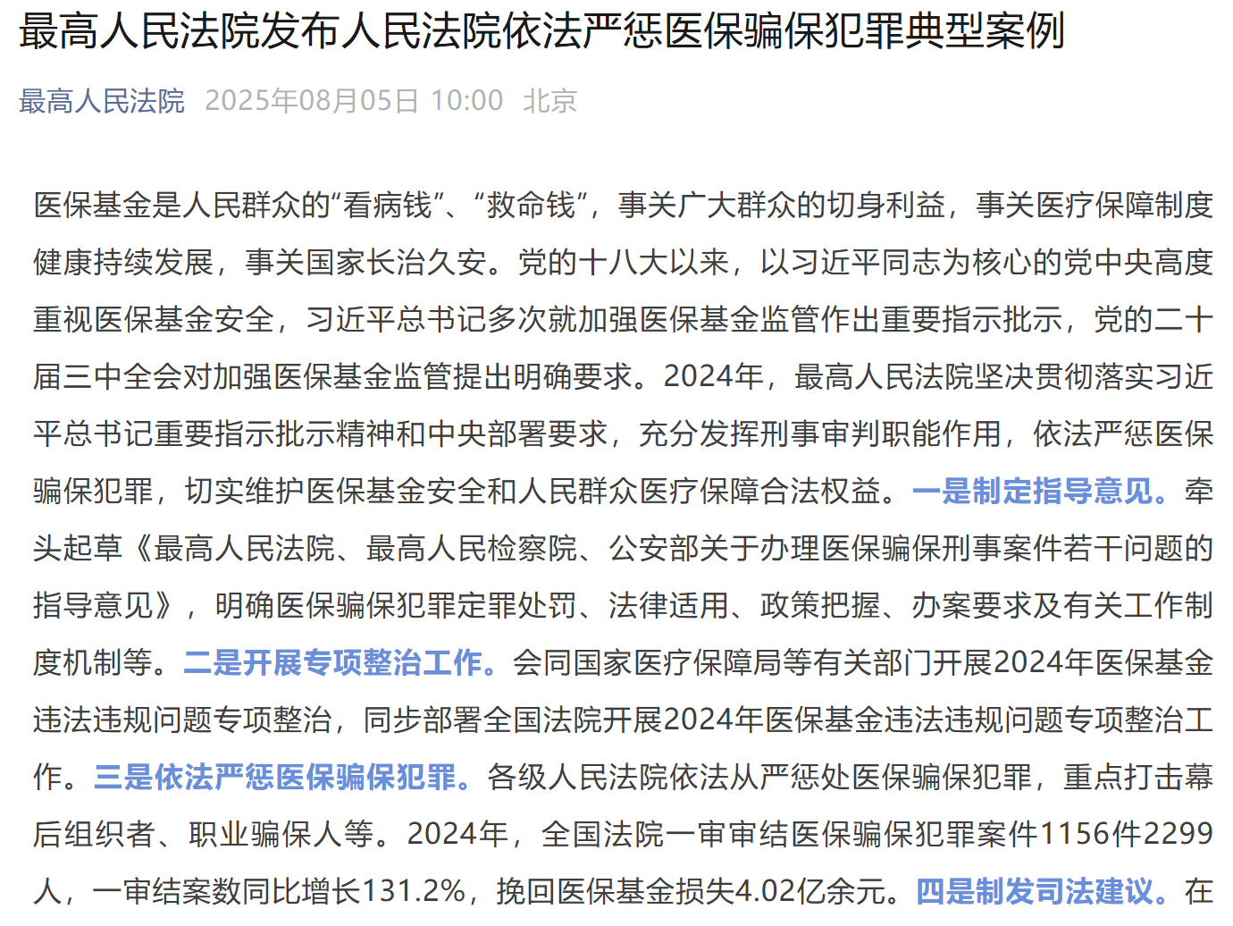 为充分发挥典型案例“办理一案、治理一片”的作用,最高人民法院从全国各级人民法院办理的医保骗保犯罪案件中,选编了4件典型案例,聚焦依法严惩,充分展示人民法院依法打击治理医保骗保犯罪的决心、举措和切实维护医保基金安全、维护人民群众医疗保障合法权益的责任、担当。