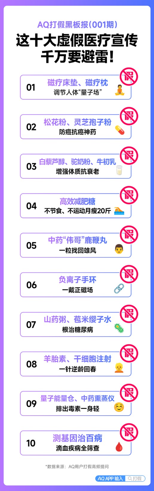 继8月18日向假医疗广告宣战后,AQ今日发布首期《打假黑板报》,根据打假辟谣专区用户提问热度,给出十大最热虚假医疗广告宣传骗局。磁疗床垫、灵芝孢子粉、白藜芦醇、驼奶粉、减肥糖、羊胎素注射、量子能量仓等生活中常见的保健品、养生仪器等产品上榜。