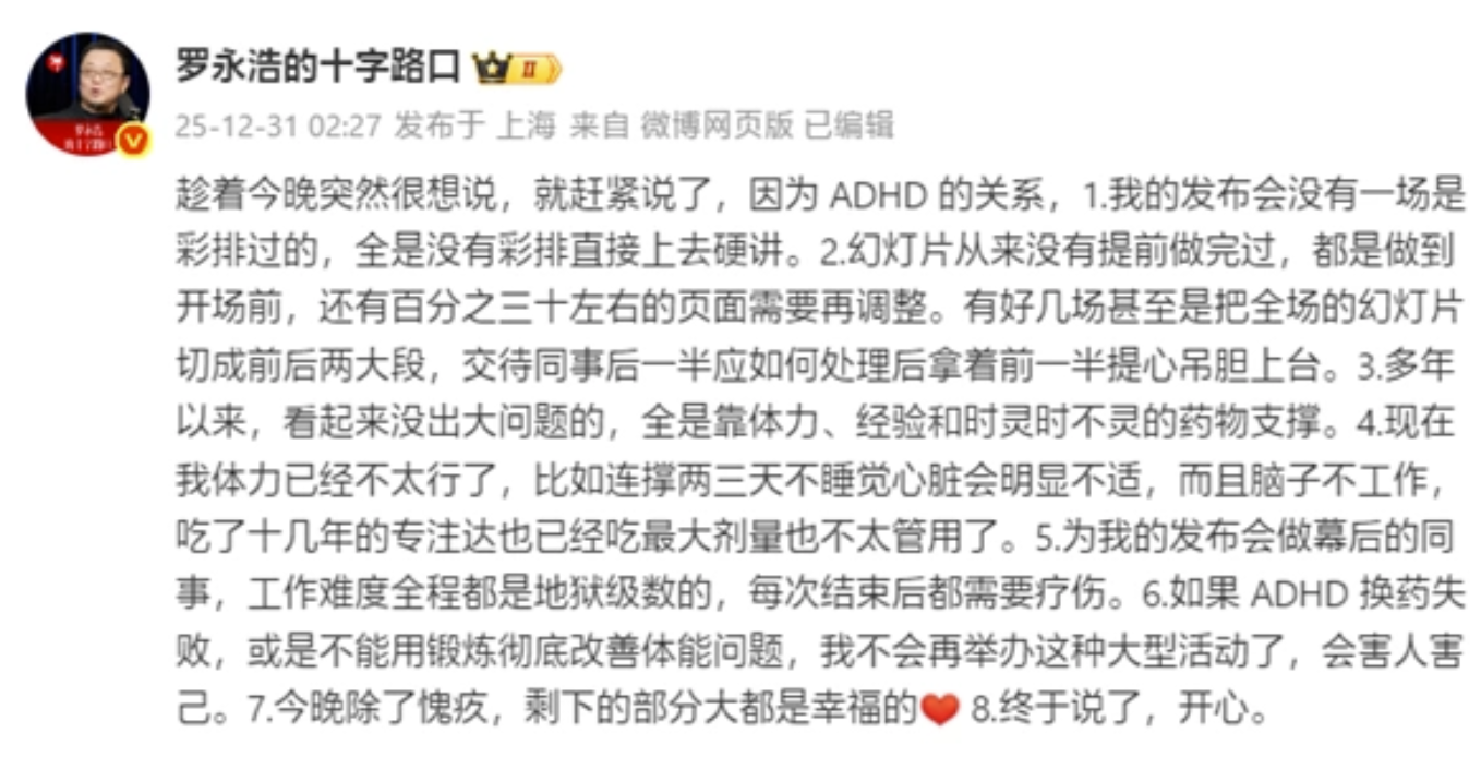 罗永浩还称,“如果 ADHD 换药失败,或是不能用锻炼彻底改善体能问题,我不会再举办这种大型活动了,会害人害己。”