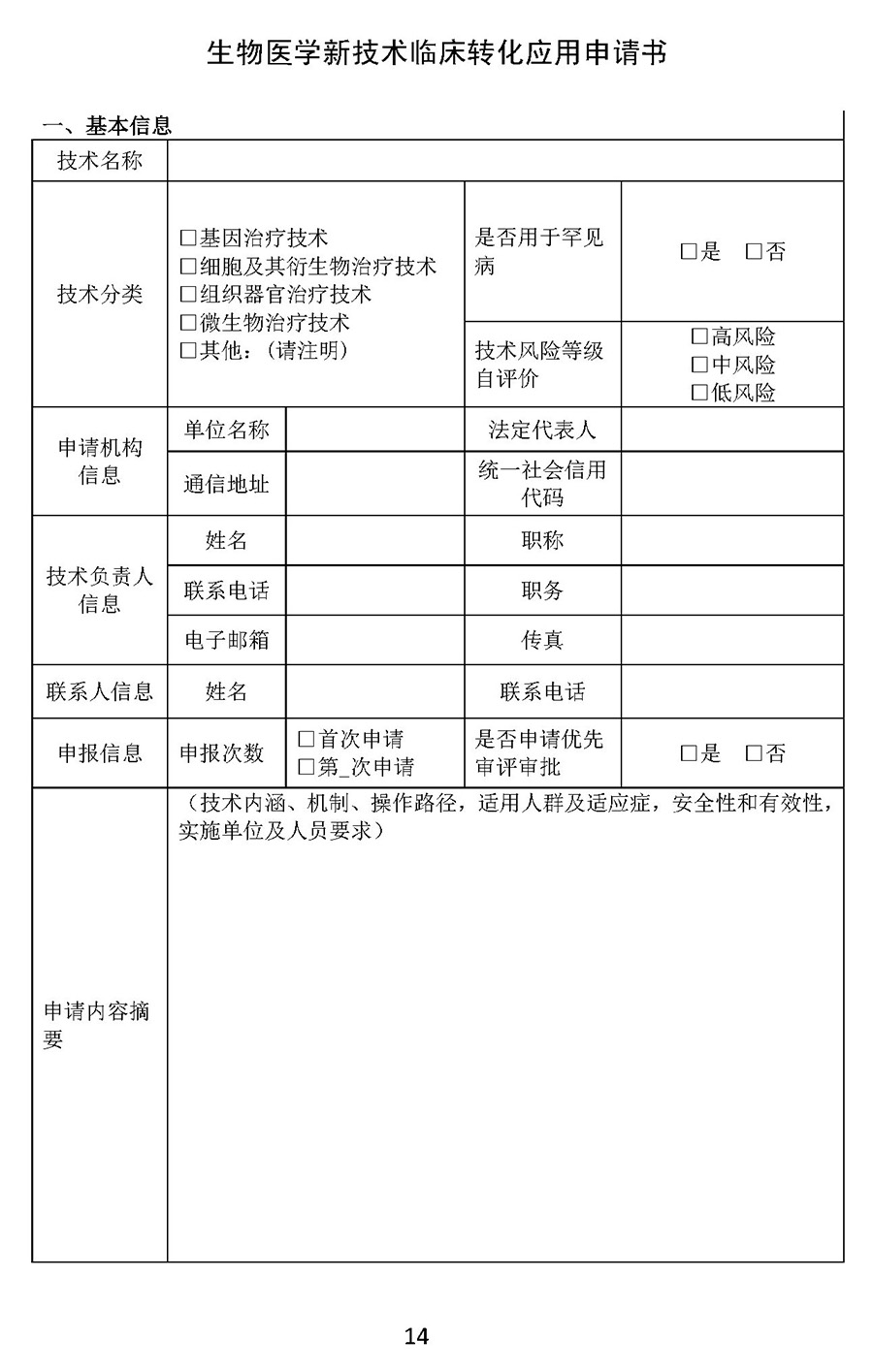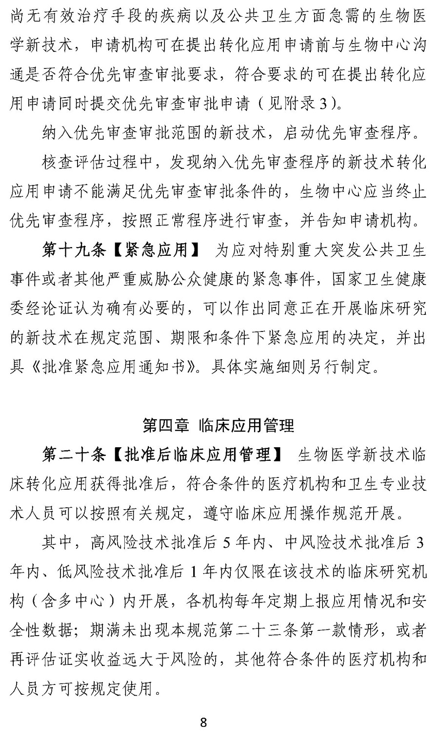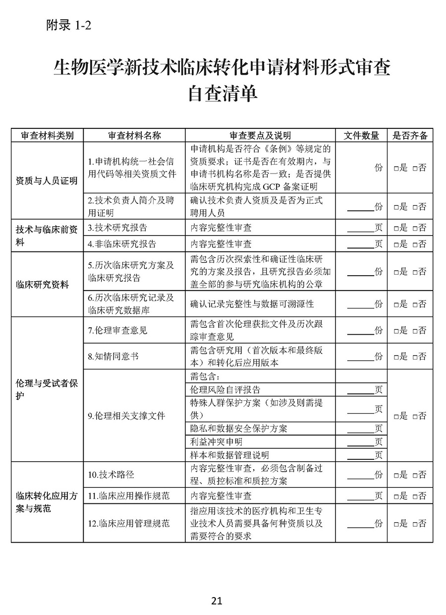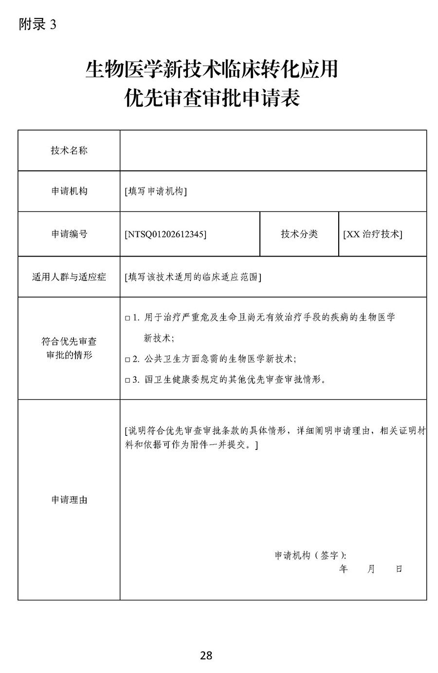 用于治疗严重危及生命且尚无有效治疗手段的疾病以及公共卫生方面急需的生物医学新技术,申请机构可在提出转化应用申请前与生物中心沟通是否符合优先审查审批要求,符合要求的可在提出转化应用申请同时提交优先审查审批申请。
