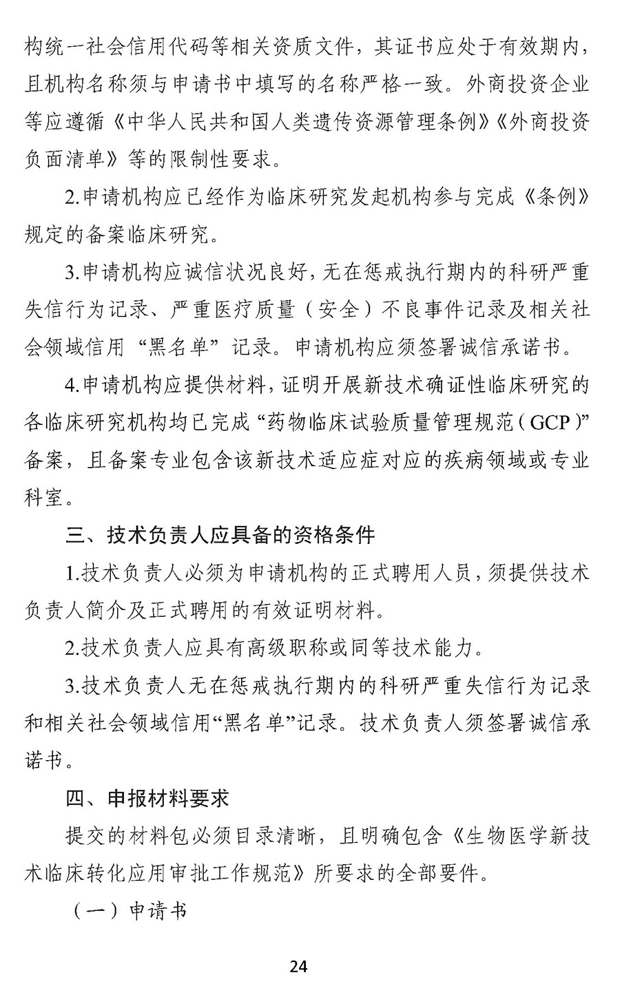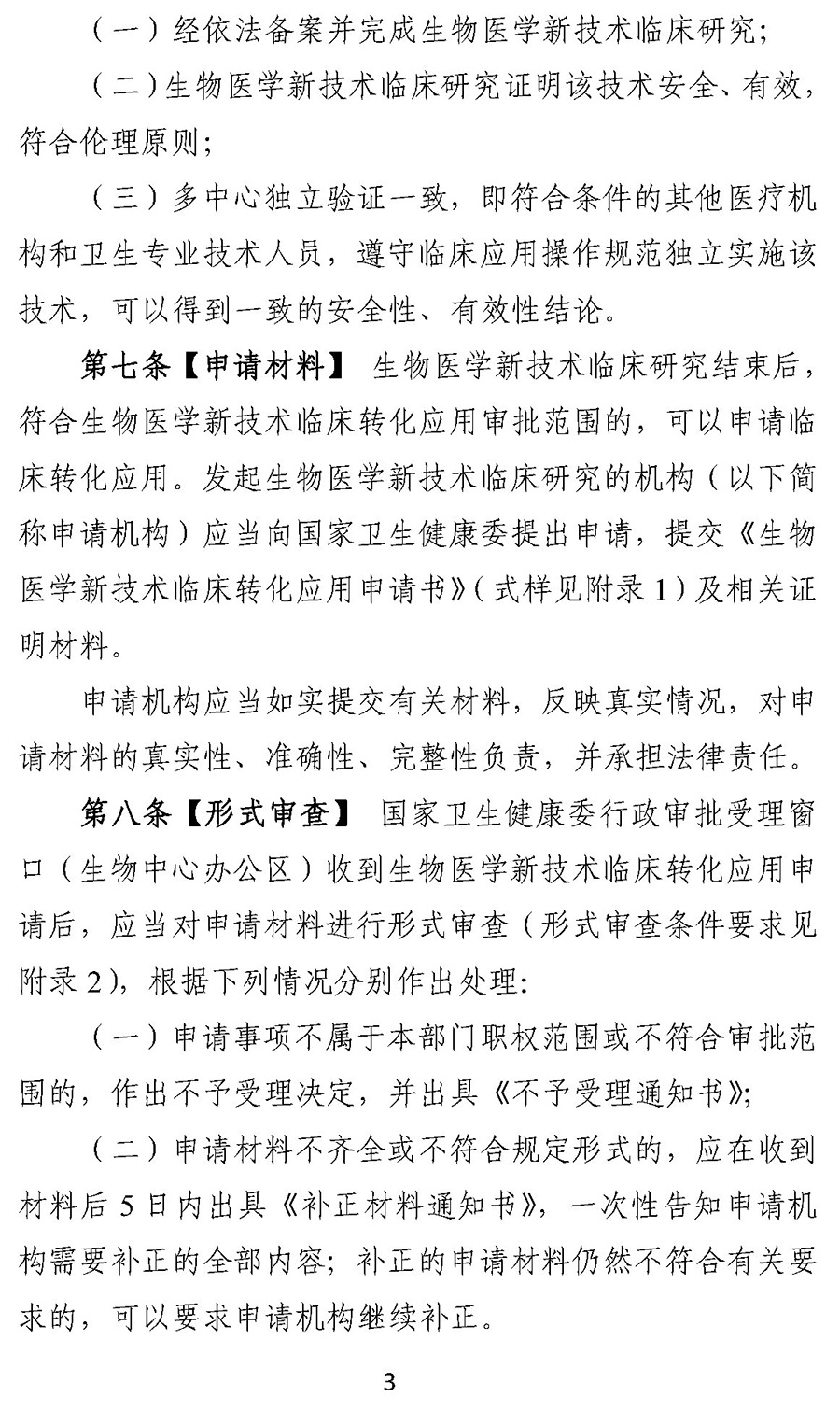 征求意见稿第六条明确生物医学新技术申请临床转化应用,应当同时具备:(一)经依法备案并完成生物医学新技术临床研究;(二)生物医学新技术临床研究证明该技术安全、有效,符合伦理原则;(三)多中心独立验证一致,即符合条件的其他医疗机构和卫生专业技术人员,遵守临床应用操作规范独立实施该技术,可以得到一致的安全性、有效性结论。