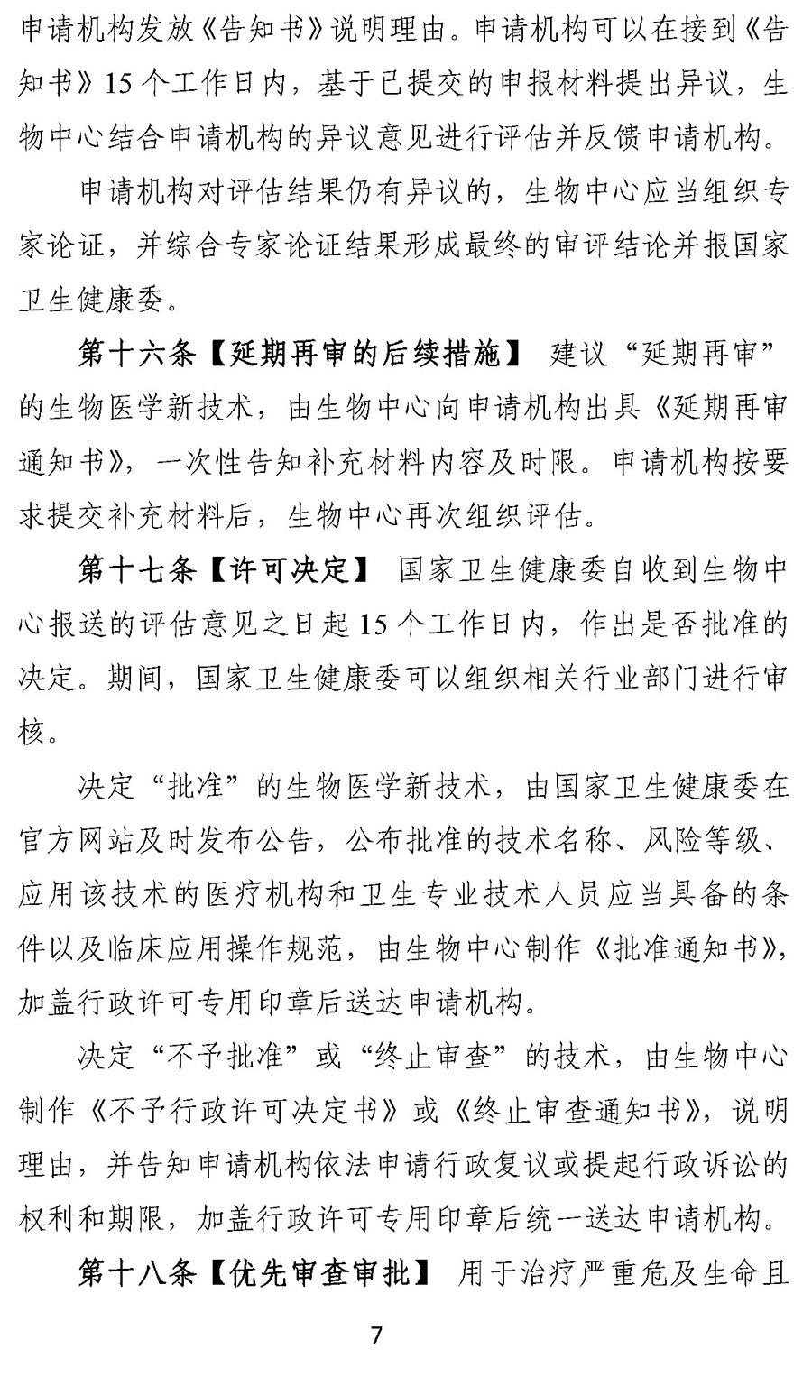 决定“批准”的生物医学新技术,由国家卫生健康委在官方网站及时发布公告,公布批准的技术名称、风险等级、应用该技术的医疗机构和卫生专业技术人员应当具备的条件以及临床应用操作规范,由生物中心制作《批准通知书》,加盖行政许可专用印章后送达申请机构。