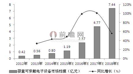 图表2:2012-2018年我国婴童可穿戴便携移动医疗电子设备市场规模及增速预测(单位:亿元,%)