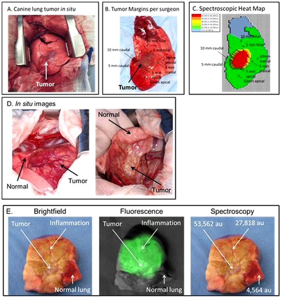 接下来,研究人员在8条持有者拥有的狗中评估了这项技术,这几条狗为不同的品种,具有不同的大小,患有自发性肺癌,被送到宾夕法尼亚大学兽医学院接受外科手术。在手术前一天,它们接受了ICG静脉注射,然后外科医生在手术过程中利用NIR,尝试可视化肿瘤,将其与正常组织区分开来。