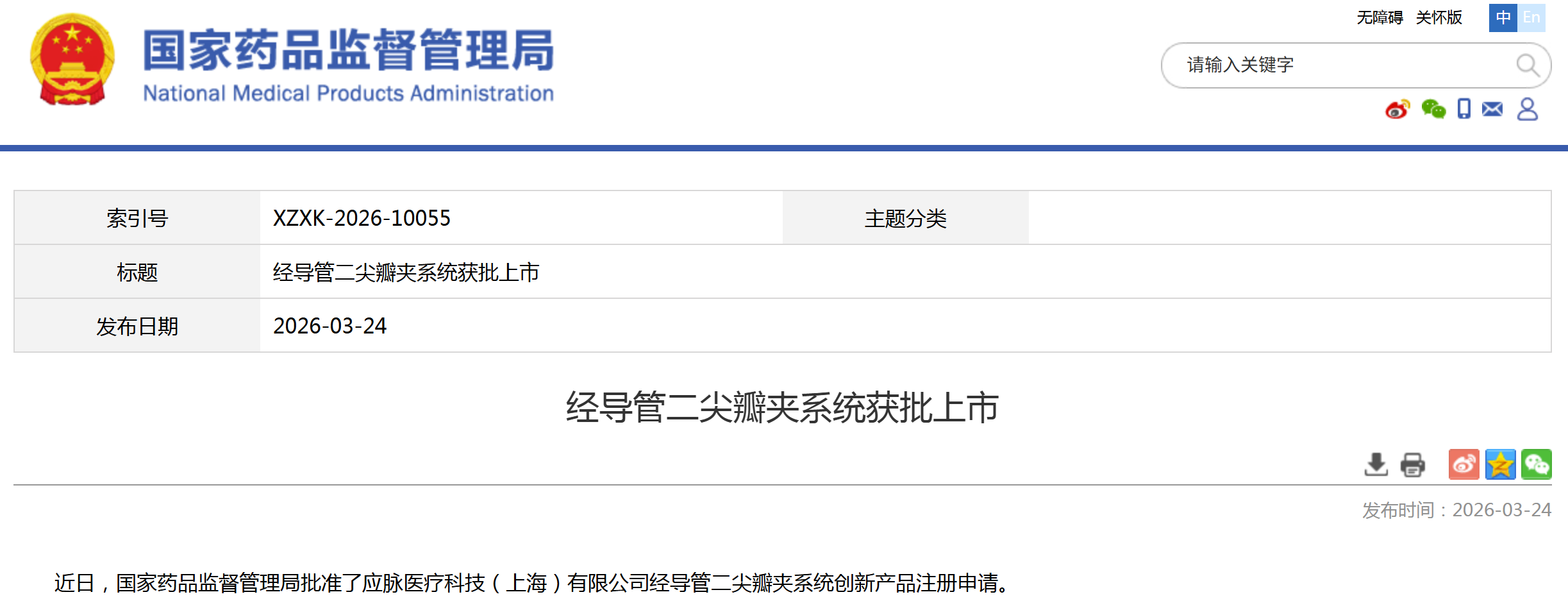 近应脉医疗科技(上海)有限公司经导管二尖瓣夹系统由二尖瓣夹及导管输送系统、可操控导引导管组成。二尖瓣夹及导管输送系统由二尖瓣夹、输送导管和可操控套管组成,二尖瓣夹各部件材料包括钴铬合金、镍钛合金、钛合金、纯钛和PET。可操控导引导管由导引导管、扩张器、紧固螺钉和硅胶垫组成。二尖瓣夹及导管输送系统根据同步控制夹片或单独控制夹片功能分为I型导管输送系统和II型导管输送系统。可操控导引导管根据手柄差异分为I型可操控导引导管和II型可操控导引导管。该产品采用经皮方式,适用于经心脏团队评估后认为存在外科手术高风险,且二尖瓣瓣膜解剖结构适合的退行性二尖瓣反流 (MR≥3+)患者。