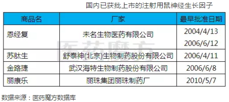 中国的制药企业和科研机构在跟踪科学前沿上并不落后。我国是世界上第一个批准注射用鼠神经生长因子上市的国家。国内目前批准上市的注射用鼠神经生长因子共由4家生产,其中未名医药(原厦门北大之路生物技术有限公司)的恩经复最早获准用于临床,舒泰神的苏肽生则是国内神经生长因子领域的第一个国药准字号产品。国内注射用鼠神经生长因子获批的适应症主要为视神经损伤和正己烷中毒性周围神经病。