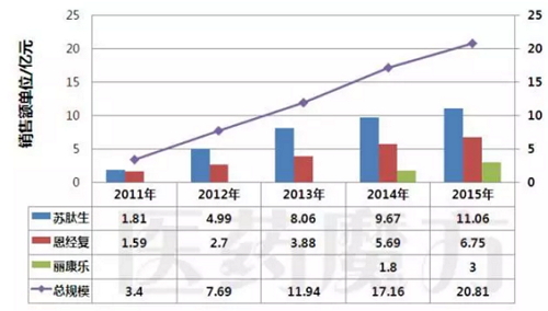 由于未获得武汉海特的销售数据,我们暂以未名医药、舒泰神和丽珠医药这3家公司的销售额进行统计分析。结果显示,国内神经生长因子市场的规模已从2011年的3.4亿元增长至2015年的20.81亿元,5年平均复合增长率为43.67%。