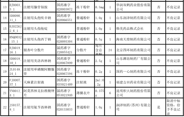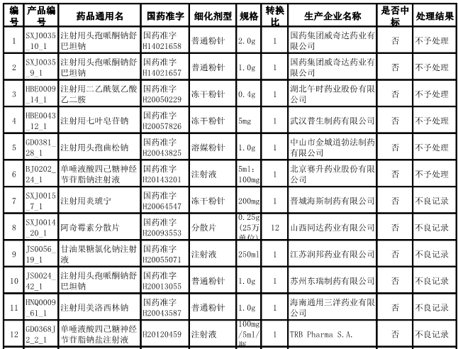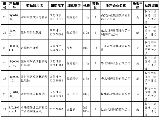 对于7家企业的8个已中标产品 ,《通知》明确其中标资格,违规品种自取消之日起不得参加本周期和下一周期四川省药品集中采购,并列入不良记录,包括华北制药的“注射用阿莫西林钠舒巴坦钠、润泽制药的”注射用氨苄西林钠“、东北制药的”注射用头孢他啶“等产品。