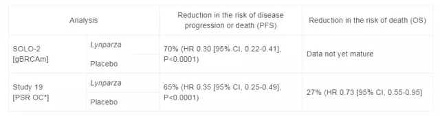 在两项随机、设置安慰剂对照的双盲、多中心临床试验中,研究人员进一步评估了这款药物作为维持疗法的可行性。在第一项名为SOLO-2的临床试验里,研究人员招募了295名复发性卵巢癌、输卵管癌、或是原发性腹膜癌患者,她们都带有gBRCA突变,且正处于铂类化疗后的缓解期。研究发现,接受olaparib治疗(300mg,每日口服两次)的患者,无进展生存期(PFS)为19.1个月,相较对照组的患者(5.5个月)得到了显著延长。