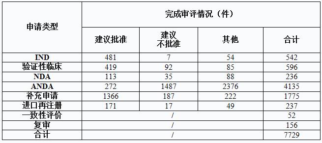 注:“其他”是指申请人主动申请撤回的注册申请、完成审评等待申请人补充完善申报资料的注册申请、非药审中心审评报送总局药化注册司的注册申请、送总局医疗器械审评中心的药械组合注册申请和关联制剂撤回的原料/辅料注册申请等,下同。