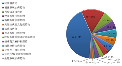 药审中心审评通过批准创新药临床试验170个品种中,抗肿瘤药物、消化系统药物和内分泌系统药物较多,占全部创新药临床试验批准数量的65%。批准临床试验的化药创新药适应症分布(以品种计)详见图9。