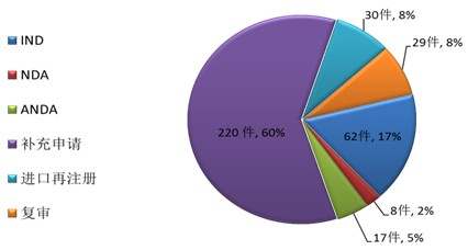 药审中心完成审评的中药注册申请366件,其中完成IND申请62件,完成NDA 8件,完成ANDA 17件。完成审评的中药各类注册申请情况详见图10。