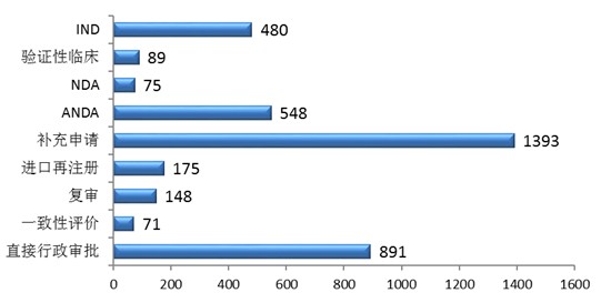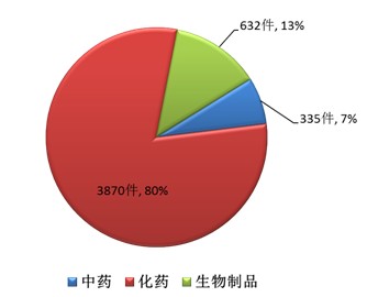 2017年,药审中心接收新注册申请共4837件,其中需审评的注册申请3783件(含一致性评价注册申请71件),直接行政审批的注册申请1054件。化药注册申请受理量为3870件,占全部注册申请受理量的80%,中药和生物制品注册申请分别为335件和632件。各类药品注册申请接收情况详见图14。