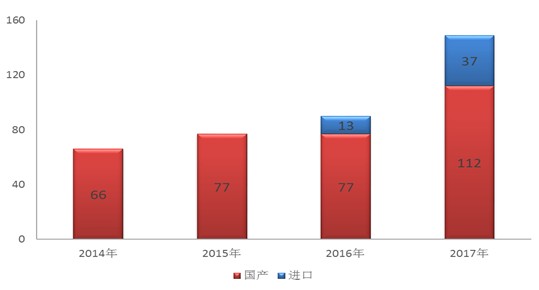 药审中心接收化药创新药注册申请149个品种,较2016年增长了66%,其中接收国产化药创新药注册申请112个品种,进口创新药注册申请37个品种,2014年- 2017年创新药注册申请接收情况详见图16。
