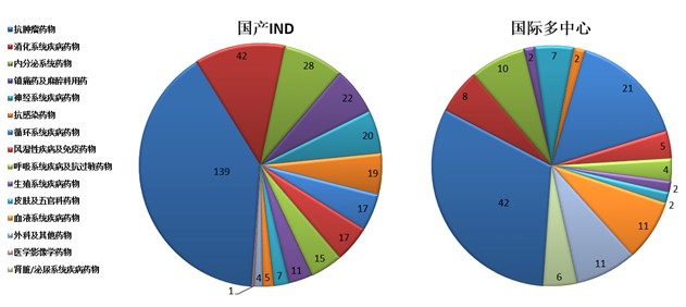 药审中心接收化药IND申请480件,其中接收国产化药IND申请347件,接收国际多中心临床试验申请133件。国产化药IND申请接收量较多的治疗领域为抗肿瘤药物、消化系统疾病药物和内分泌系统药物。国际多中心临床试验申请接收量较多的治疗领域为抗肿瘤药物、循环系统疾病药物和血液系统疾病药物,具体治疗领域分布详见图17。
