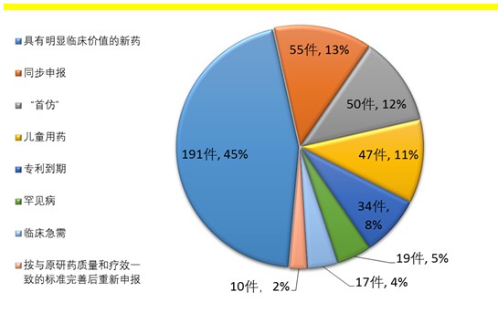 根据总局《关于解决药品注册申请积压实行优先审评审批的意见》(食药监药化管〔2016〕19号),截至2017年底,药审中心共将25批423件注册申请纳入优先审评程序,其中具有明显临床价值的新药占比最大,共191件,占45%,儿童用药共47件。纳入优先审评程序的注册申请情况详见图20。