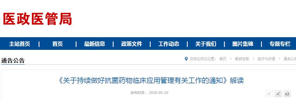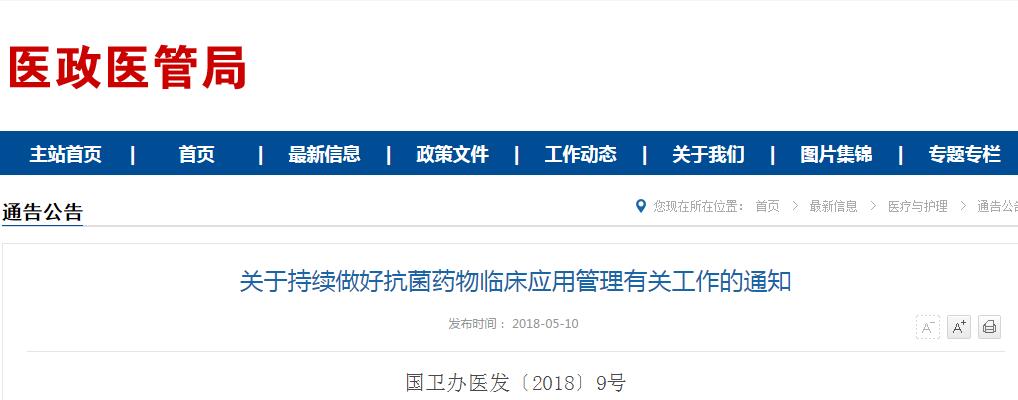 近日,医政医管局发布《关于持续做好抗菌药物临床应用管理有关工作的通知》国卫办医发〔2018〕9号,要求进一步加强抗菌药物临床应用管理。