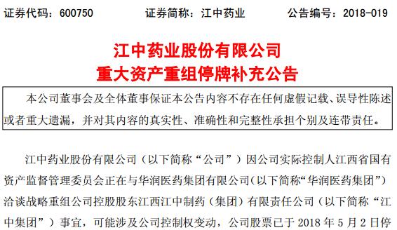 同时,公告还称江中药业正筹划收购华润医药集团有限公司下属华润江西医药有限公司控股权、江西南昌桑海制药有限责任公司控股权、江西南昌济生制药有限责任公司控股权。