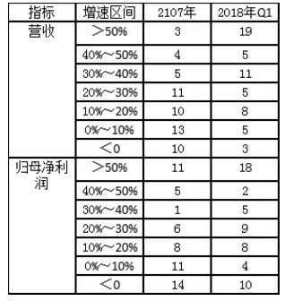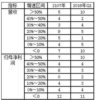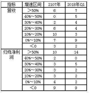 从各公司角度来看,不排除并购重组和非经常性收益,2017年医药商业板块共有 23 家公司营收增长、1家营收下滑;21家公司归母净利润增长、3家下滑。2018年一季度共有21家公司营收增长、3家营收下滑;22家公司归母净利润增长、2家下滑,见表5。