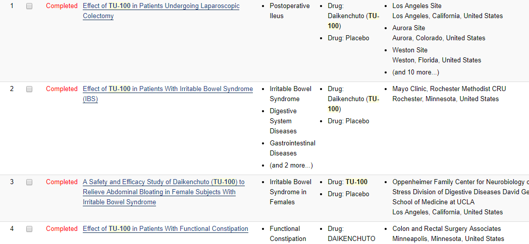 当时,这个汉方药的最大企业一口气进行了多达8个临床试验,涉及许多疾病。其中包括:过敏性肠炎(IBS),克罗恩病(Cronh's Disease),腹胀,便秘,肠梗阻等。